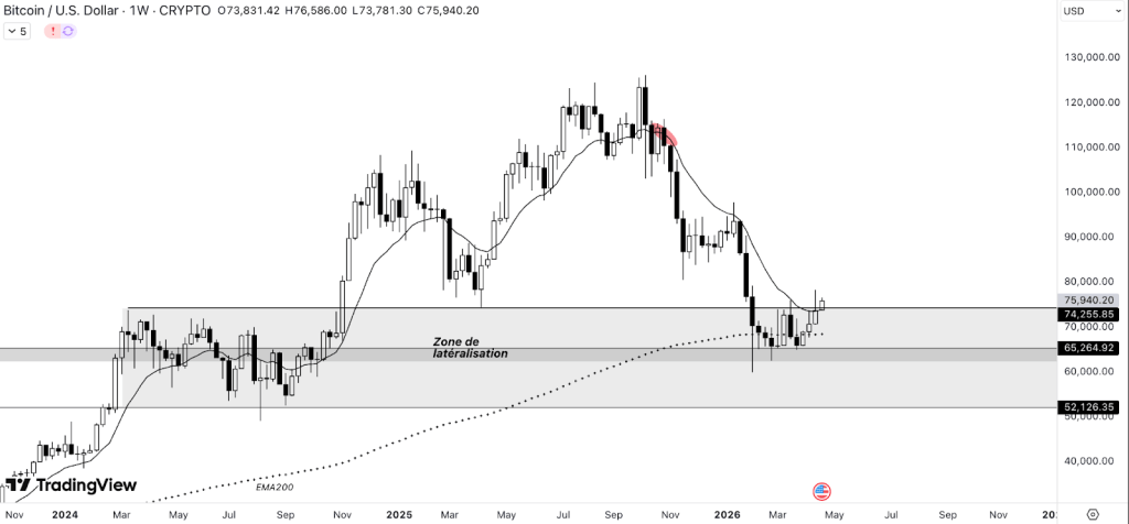 Face au dollar, le BTC oscille autour 75 000 dollars et se rapproche progressivement de résistances clés.