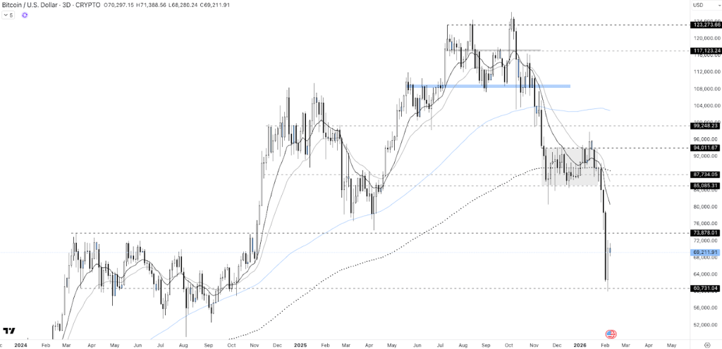 Après un passage sous les 85 000 dollars et un rapprochement dangereux des 73 800 dollars, BTC a très brièvement chuté vers les 60 000 dollars, atteignant le niveau identifié dans notre précédente newsletter, en date de mardi dernier.