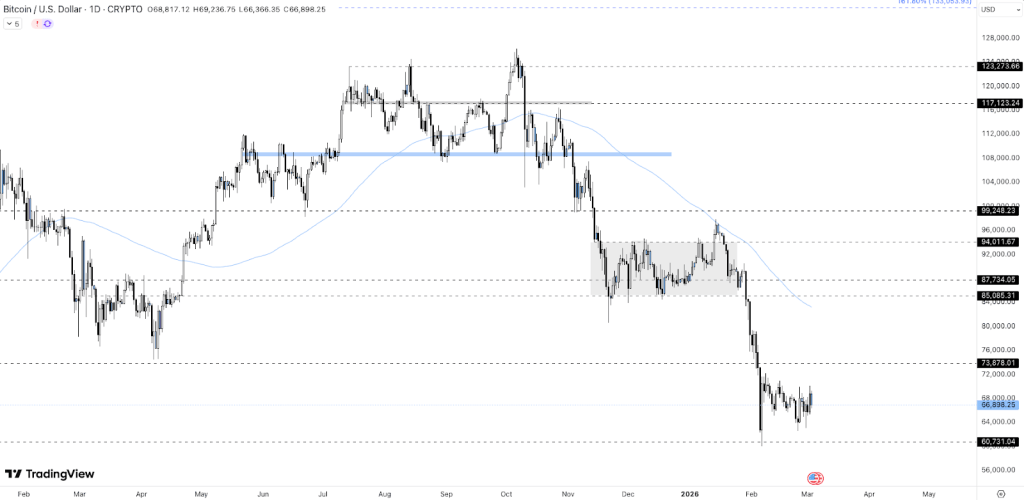 Techniquement, bitcoin livre une bataille acharnée autour du pivot psychologique des 65 000 $ depuis le début du mois de février. En pleine période de latéralisation, confiné sous les 70 000 dollars, les yeux sont rivés sur une sortie de la zone actuelle pour reprendre la direction des 85 000 dollars.