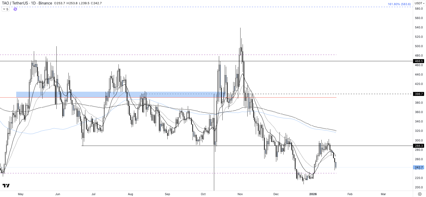 TAO se construit généralement de manière progressive. Pour le moment, ce qu’il faut espérer, c’est une installation durable au-dessus de la zone des 300 dollars, ce qui offrirait un signal de reprise à la hausse, avec un potentiel renforcé pour se diriger vers la zone des 400 dollars.